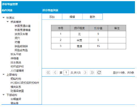 系統(tǒng)具有對(duì)每類橋梁需養(yǎng)護(hù)的部件進(jìn)行預(yù)設(shè)置,并且支持按照重要程度進(jìn)行分類。