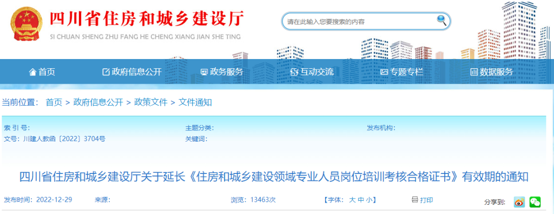 四川省住房和城鄉(xiāng)建設(shè)廳關(guān)于延長《住房和城鄉(xiāng)建設(shè)領(lǐng)域?qū)I(yè)人員崗位培訓(xùn)考核合格證書》有效期的通知