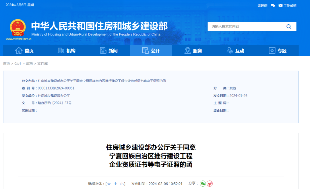 2月6日,住建部發(fā)布《關(guān)于同意寧夏回族自治區(qū)推行建設(shè)工程企業(yè)資質(zhì)證書等電子證照的函》。