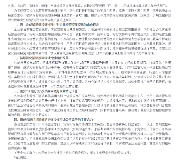 以前招標方以營業(yè)執(zhí)照記載的經(jīng)營范圍為理由排斥其他投標人,可能還屬于打了擦邊球,被排斥的投標人有口也說不出啥。而此次發(fā)改委的政策通知一出,就相當于官宣了,以后招標方就不能再這樣操作了?。?!